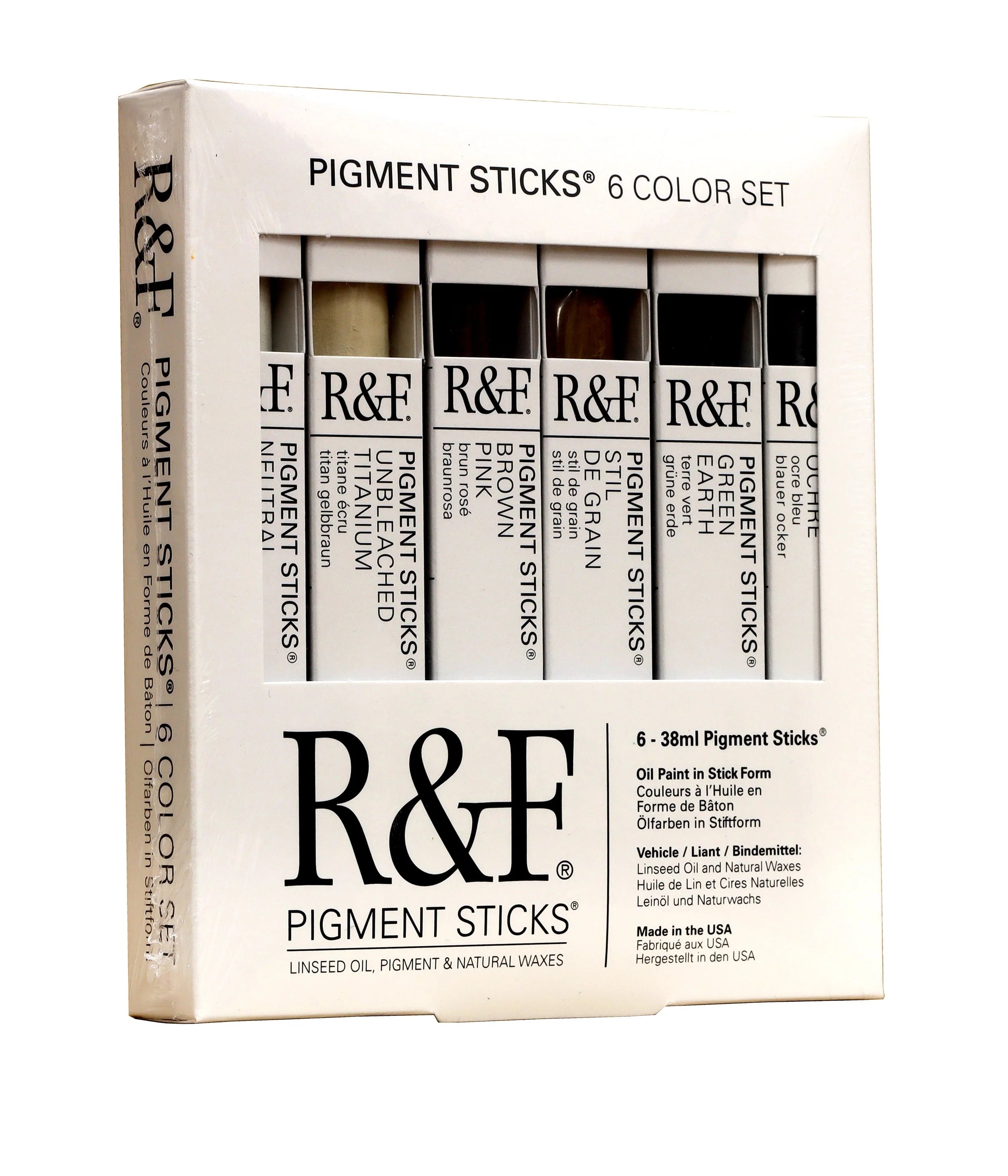 A collection of six 38 ml. sticks in colors that can be found in nature, this set contains Neutral White, Unbleached Titanium, Brown Pink, Stil de Grain, Green Earth, and Blue Ochre.